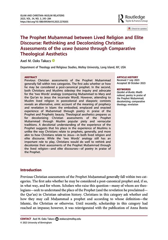 Takacs, Axel M. Oaks. “Prophet Muhammad Between Lived Religion and Elite Discourse: Rethinking and Decolonizing Christian Assessments of the Uswā Ḥasana through Comparative Theological Aesthetics.” Islam and Christian-Muslim Relations 34, no. 3 (2023): 245–284.