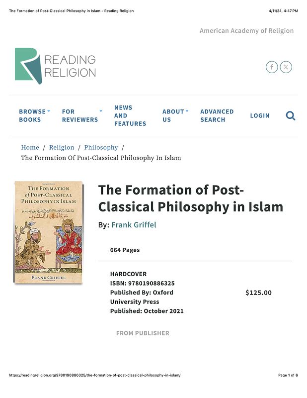 Takacs, Axel M. Oaks. “Review: The Formation of Post-Classical Philosophy in Islam, By Frank Griffel.” Reading Religion, 2024.