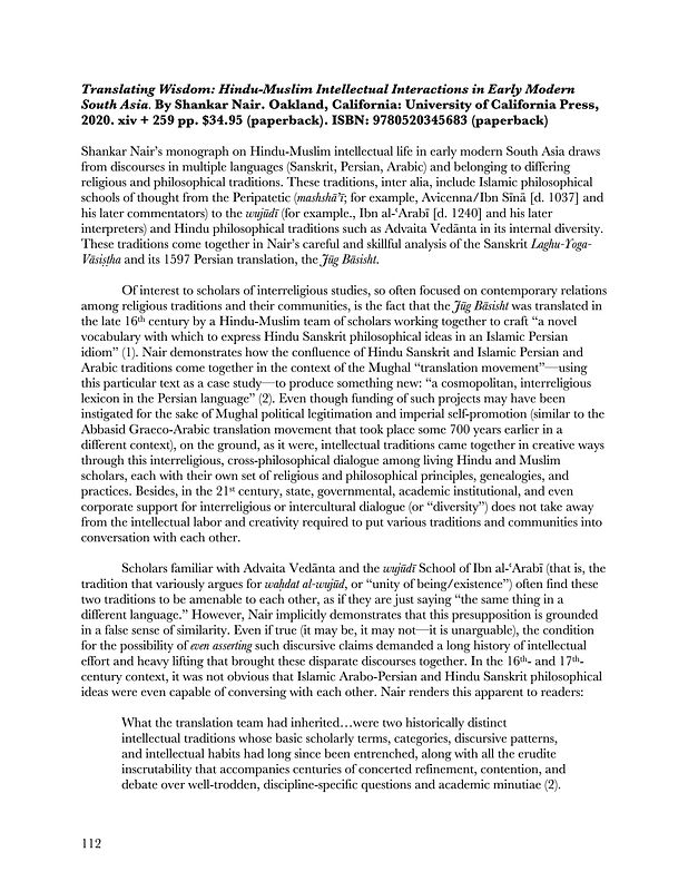 title = {Review: Translating Wisdom: Hindu-Muslim Intellectual Interactions in Early Modern South Asia, By Shankar Nair},