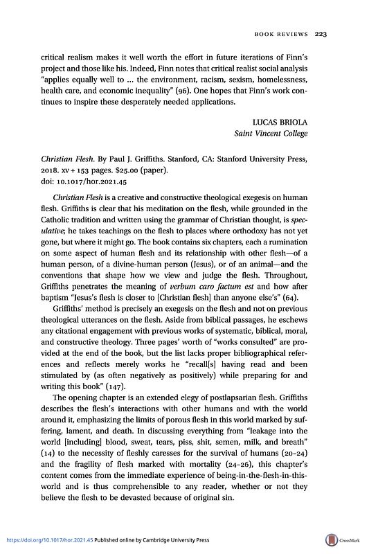 Takacs, A. M. O. (2021). Review: Christian Flesh, By Paul J. Griffiths. Horizons: The Journal of the College Theology Society, 48(1), 223–224. https://doi.org/10.1017/hor.2021.45