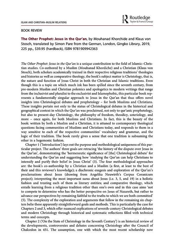 title = {Review: The Other Prophet: Jesus in the Qur’an by Mouhanad Khorchide and Klaus von Stosch, translated by Simon Pare},