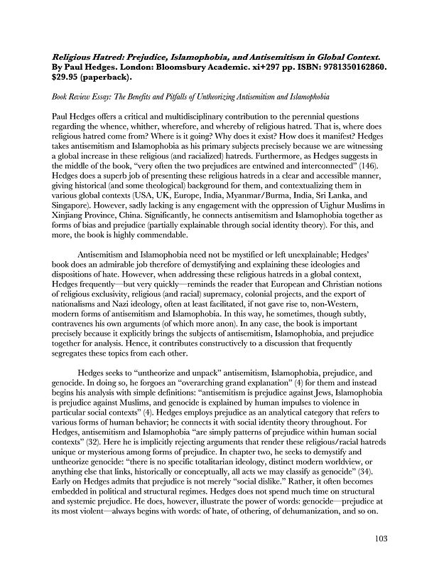 title = {Review Essay: Religious Hatred: Prejudice, Islamophobia, and Antisemitism in Global Context, by Paul Hedges},