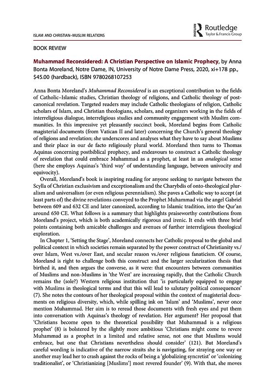 Takacs, Axel M. Oaks. “Review Essay: Muhammad Reconsidered: A Christian Perspective on Islamic Prophecy, By Anna Bonta Moreland.” Islam and Christian-Muslim Relations 31, no. 3 (2020): 341–348.