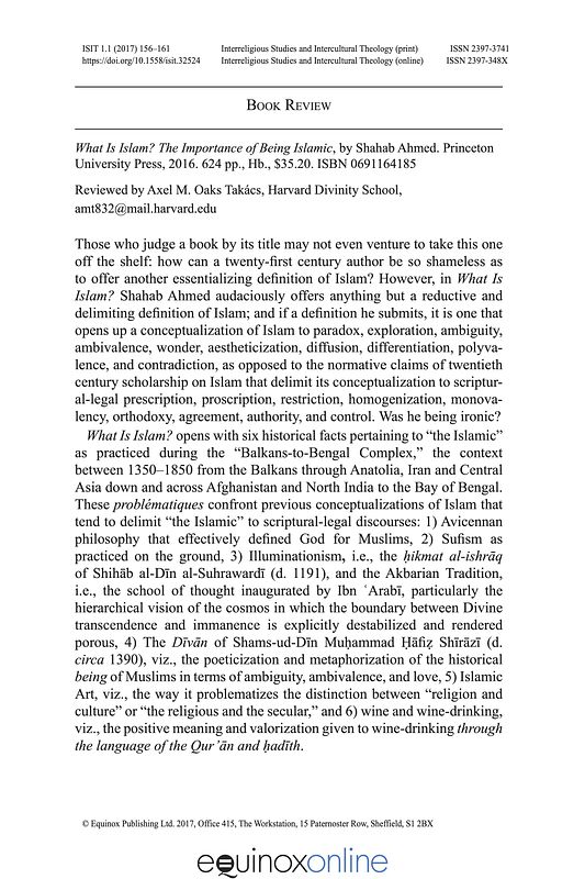 Takacs, A. M. O. (2017). Review Essay: What Is Islam?: The Importance of Being Islamic, by Shahab Ahmed. Journal of Interreligious Studies and Intercultural Theology, 1(1), 156–161.