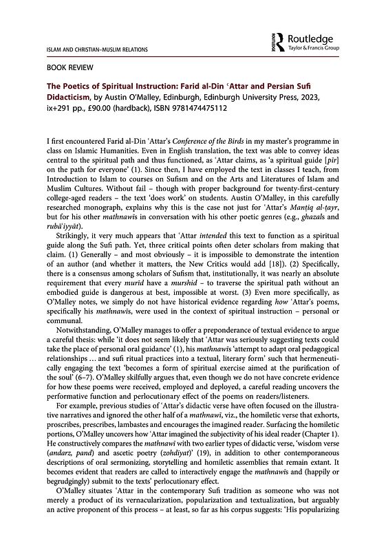 Takacs, A. M. O. (2024). Review: The Poetics of Spiritual Instruction: Farid al-Din ʿAttar and Persian Sufi Didacticism. Islam and Muslim-Christian Relations, Early View. https://doi.org/10.1080/09596410.2024.2346003